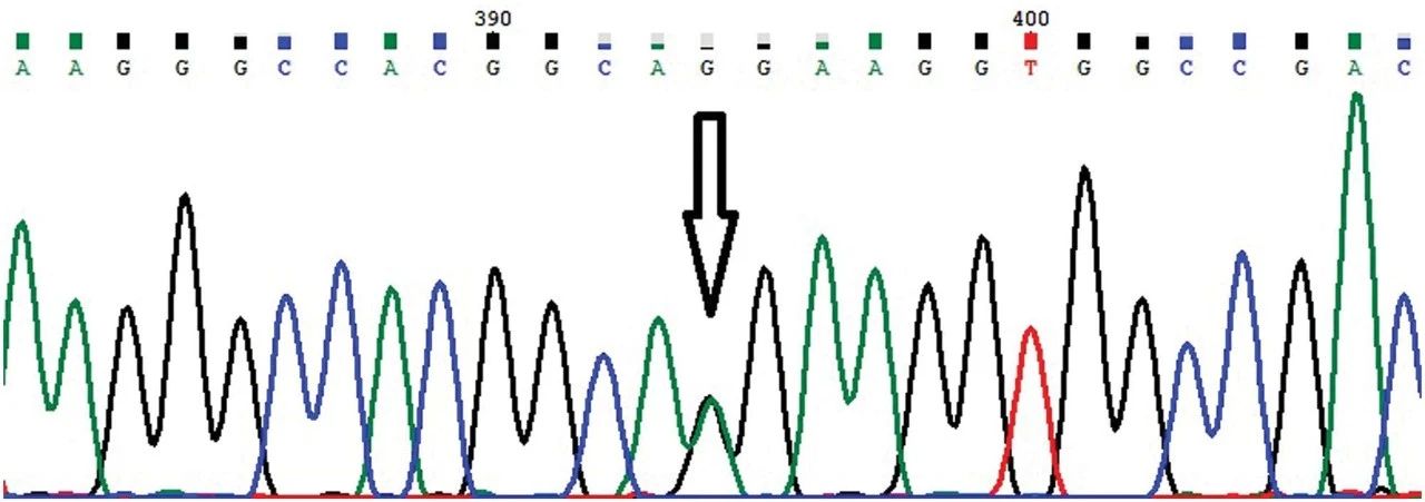圖.Hb-柳州Sanger序列測定結(jié)果。箭頭表示雜合突變[HBA1:C.182A→G] 在HBA1基因中。