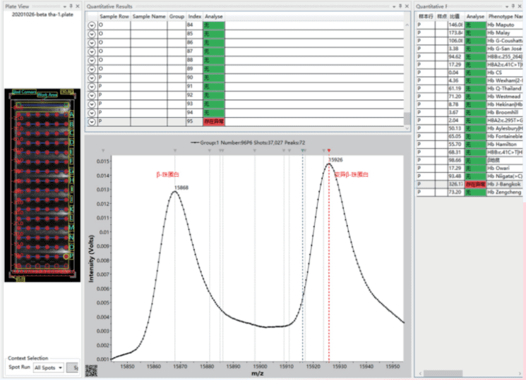 基于MALDI-TOF MS的血紅蛋白病表型篩查系統(tǒng),可實(shí)現(xiàn)對(duì)?β- 地中海貧血(圖 1)和近100種異常血紅蛋白的檢測(cè)(圖 2, 3)